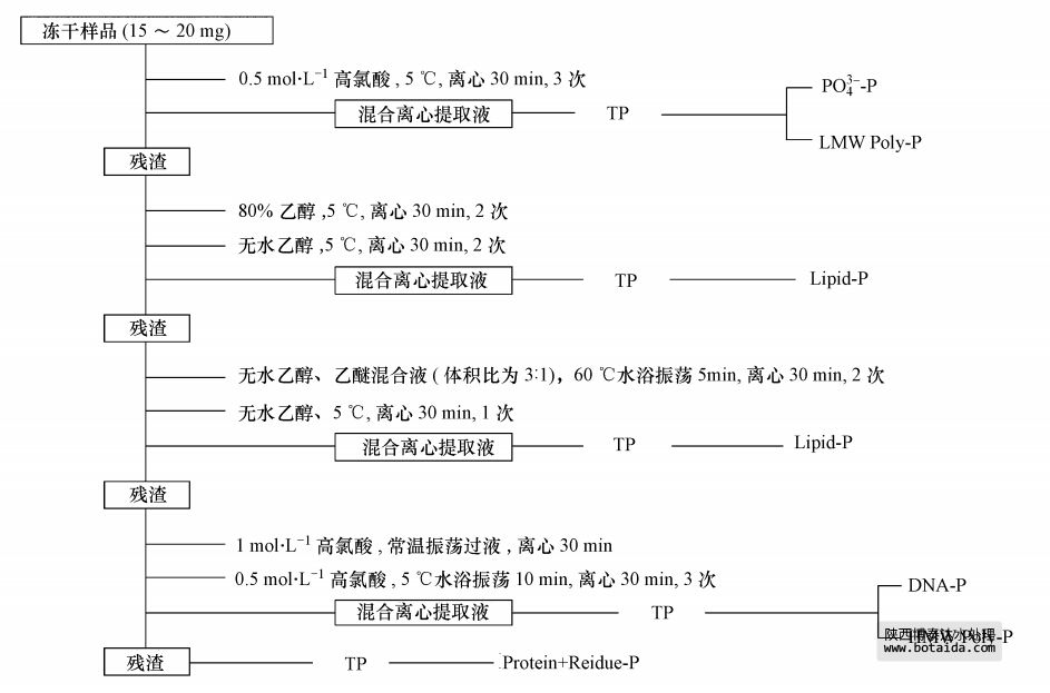 污泥和細菌細胞中不同形態(tài)磷含量的測定采用改進的STS法,具體測量步驟見圖 1.該法將樣品中的磷分為正磷酸鹽(PO3-4-P)、低分子量聚磷酸鹽(LMW Poly-P)、磷脂(Lipid-P)、DNA磷(DNA-P)、高分子量聚磷酸鹽(HMW Poly-P)、蛋白質磷和殘渣磷(Protein+Residue-P).混合離心提取液中TP含量測定時采用封閉回流消解法預處理,用鉬銻抗法測定TP和PO3-4-P含量,DNA-P含量由DNA含量乘以系數(shù)9.2%計算得到(磷是DNA的特征元素,含量相對恒定),差減計算得到LMW Poly-P和HMW Poly-P含量.