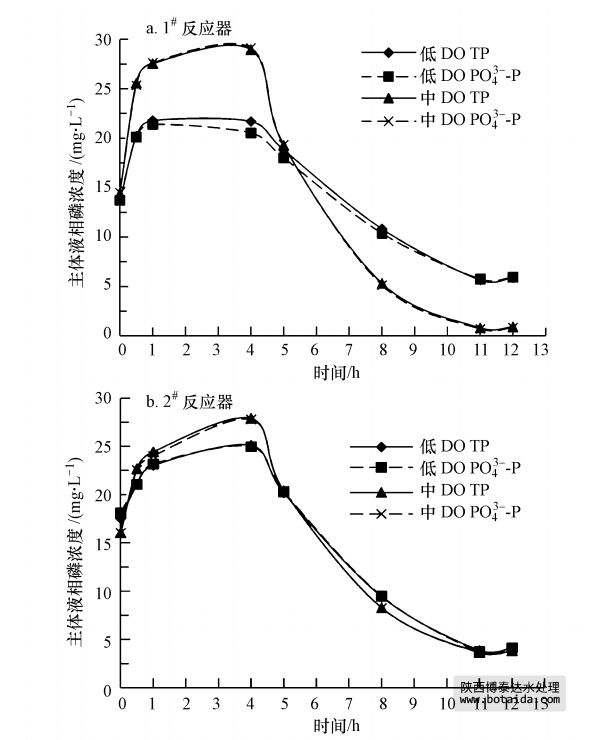 由圖 2可以看出,不同SRT和DO條件下反應器主體液相磷濃度的變化均表現(xiàn)為厭氧升高、好氧降低,說明兩組A/O-SBR系統(tǒng)具有良好的生物強化除磷(EBPR)性能,聚磷菌(PAOs)獲得生長競爭優(yōu)勢.反應器進水磷源為KH2PO4,反應過程中液相的PO3-4-P濃度占TP濃度的95%以上,說明污泥絮體厭氧釋放和好氧吸收的磷主要為PO3-4-P.