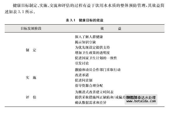 對于改善飲用水安全,資源分配的一個重要概念是在健全的風險管理系統支持下,可能先 建立一個較為寬松的過渡目標,用來鼓勵飲用水質量的漸進式改進。在這方面,健康目標可以 作為支持和衡量水質逐步改善的依據。可以通過制訂漸趨嚴格的健康目標或通過演化出能更 準確反映健康保護要求的健康目標,來促進水質的改善(例如從特定技術目標到性能目標)。
