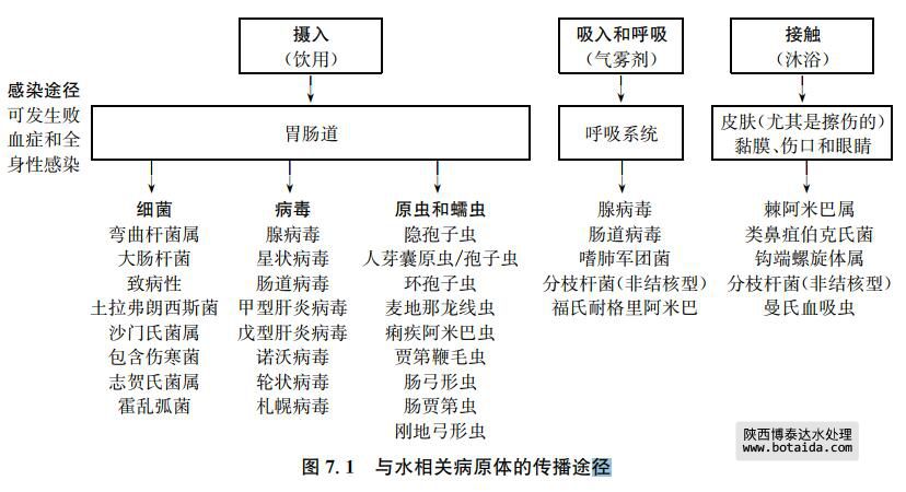 盡管使用被污染飲用水產生的風險最大,但其他傳播途徑也可導致疾病發生,一些病原 體可通過多種途徑傳播(例如:腺病毒)(見圖7.1)。吸入水滴(氣霧劑)可引發某些嚴重疾 病,這是由于水滴中溫度適宜,且有營養物質存在,致病微生物可以快速繁殖。這些疾病包 括由軍團菌屬引起的軍團病,以及由福氏耐格里阿米巴[原發性阿米巴腦膜腦炎(PAM)]和 棘阿米巴屬(阿米巴腦膜炎,肺部感染)引起的疾病。