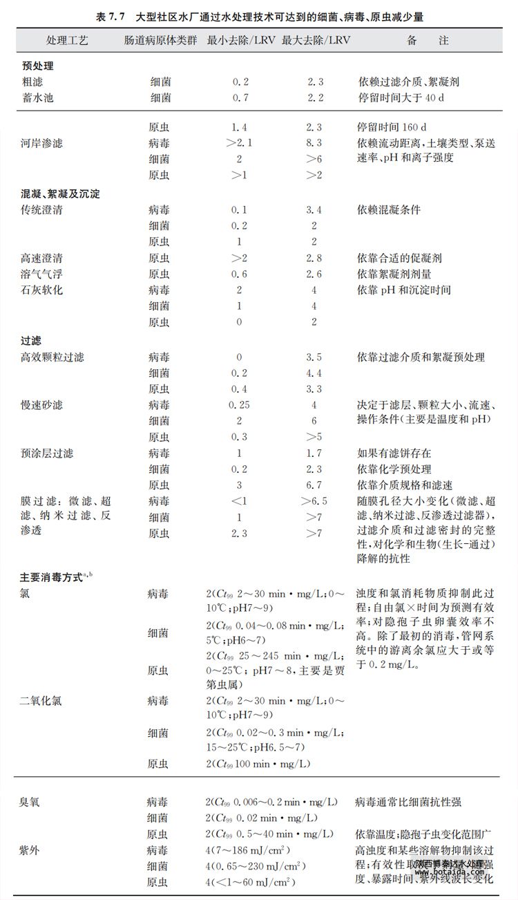 很高質(zhì)量的水,例如來自封閉含水層的地下水,可能主要依靠對(duì)水源水和配水系統(tǒng)的保護(hù) 作為主要的控制措施來保證用水安全。更常見的是實(shí)施水處理以清除或殺滅病原體。大多情 況下(如水質(zhì)差的地表水),需要對(duì)水進(jìn)行多道工序處理,如混凝、絮凝、沉淀、過濾和消毒。表 7.7對(duì)水處理工藝進(jìn)行了總結(jié),這些工藝有時(shí)單獨(dú)使用、有時(shí)聯(lián)合使用以去除微生物(也見附錄 5)。最小和最大的去除量用lg表示,它們分別在故障或者最佳處理?xiàng)l件下出現(xiàn)。