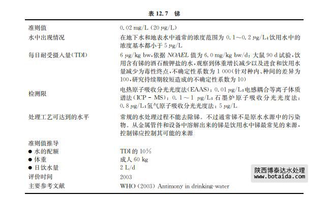 銻與銅、鉛和錫可合成硬質合金。銻化合物有多種醫療用途,銻被認為是可作為焊料的 鉛的替代品,但沒有任何證據證明由此而污染飲用水(見表12.7)。來自環境、食物和飲用水 方面的接觸相對于某些職業的接觸要低得多。