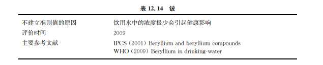 由于鈹非常罕見,如果曾經出現過在飲用水中發現了有危害的濃度,也沒必要為它建立 一個正式的飲用水準則。 以一個長期的關于犬類的小腸損傷的研究作為毒性終點,假設飲用水犜犇犐配額取 20%,一個體重60kg的成年人每天飲用2L水,犜犇犐取2μg/kgbw可計算出飲用水中鈹的健康標準為12μg/L。這個分配定額可能是保守的,因為來源于食物接觸的有限數據表明此 來源可能遠低于犜犇犐值。 盡管鈹似乎在飲用水源和飲用水中存在濃度都很低,水中濃度的數據有限,但也會存在 可能的特殊情況,自然條件中pH值低于5或者高于8或者高濁度的情況下鈹濃度會有所 升高。