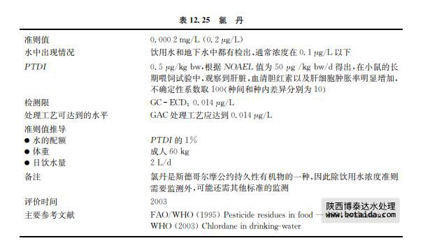 氯丹(CASNo.57 47 9)自1947年開始使用,是一種廣譜殺蟲劑(見表12.25)。目 前,許多國家已經開始嚴格限制氯丹的使用,現僅通過液下噴射的方式用于殺除土壤中的白 蟻。經液下噴射使用時,氯丹會成為地下水污染的潛在污染源,但濃度較低。氯丹工業品是 混合物,主要由順式和反式氯丹組成。氯丹不易自然降解,在土壤中不易遷移也不易進入地 下水(僅少量檢出)。氯胺易散失進入大氣。雖然食物中所含氯胺的濃度水平一直在降低, 但氯胺具有持久性和較強的生物累積可能。