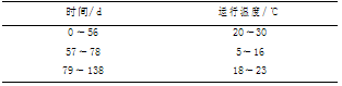 反應器每天運行 4 個周期,每個周期 6 h,分為: 進水 10 min,厭氧 80 min,好氧 210 min,沉淀 ( 30 ~ 3) min( 沉淀時間在顆粒培養階段逐漸由 30min 遞減至 3 min,顆粒成熟之后保持 3 min) ,排水 10 min,剩余時間閑置,反應器換水比為 75% . 運行過程中對 pH 不做控制,控制曝氣流量為 1. 50L·min - 1 ,運行溫度變化如表 1 所示.