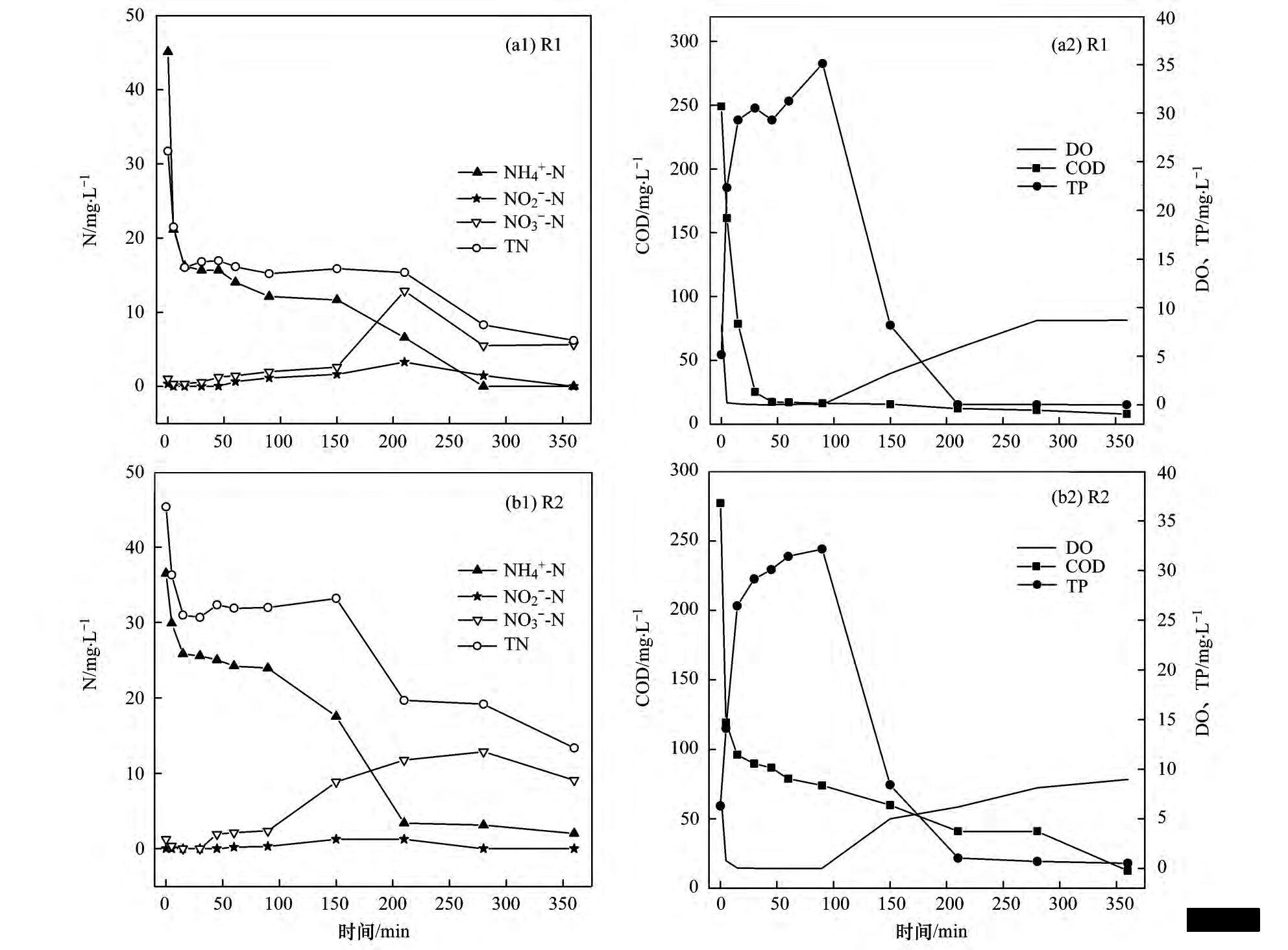 圖 6 R1 和 R2 反應器中典型周期( 128 d) 內各污染物濃度變化