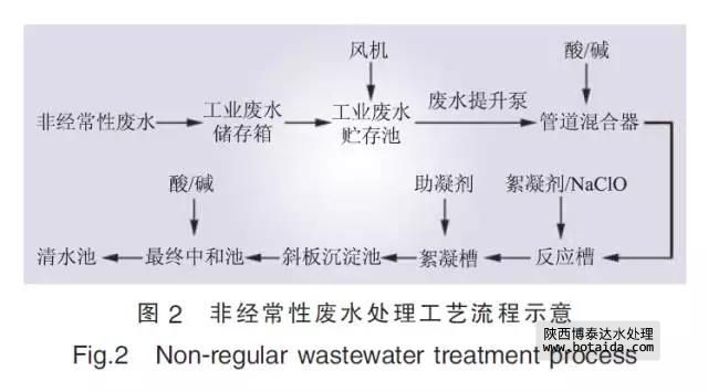 非經常性廢水處理系統工藝流程如圖2所示, 調整pH值后的廢水先后經過反應槽、絮凝槽完成凝聚、絮凝反應, 然后進入斜板沉淀池完成絮凝體與水的分離。沉淀池上部的清水自流進入最終中和池進行pH值調整, 最終出水流入清水池, 與經常性廢水匯總。