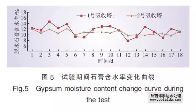 由圖3—7可以看出, 試驗期間, 雖然混入處理后的工業廢水量不斷加大, 但脫硫系統漿液密度均能維持在1 130 kg/m3左右, 且脫硫效率仍然大于或等于95%; 脫硫副產品石膏品質未發生明顯變化, 石膏的含水率基本保持在10%, 石膏中CaCO3質量分數小于3%, CaSO4· 2H2O純度大于90%, 符合商用石膏品質要求。此外, 試驗期間除霧器壓差處于正常運行范圍之內, 吸收塔沒有發生起泡、堵塞等不正常現象。試驗結果表明, 處理后的工業廢水可用作脫硫工藝水。