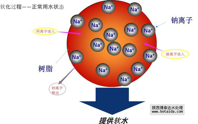 當水中的鈣鎂離子含量高時,離子交換樹脂可以釋放出鈉離子,功能基團與鈣鎂離子結合,這樣水中的鈣鎂離子含量降低,水的硬度下降。硬水就變為軟水,這是軟化水設備的工作過程。