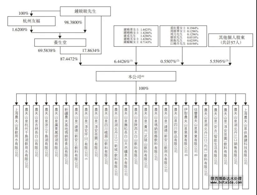 農夫山泉上市后總股本大約為118.9億股,鐘睒睒通過旗下公司持股84.4%,從下圖可見,鐘睒睒持股高度集中,上市前沒有引入PE等機構,也沒有聯合創始人、高管分享其股權。