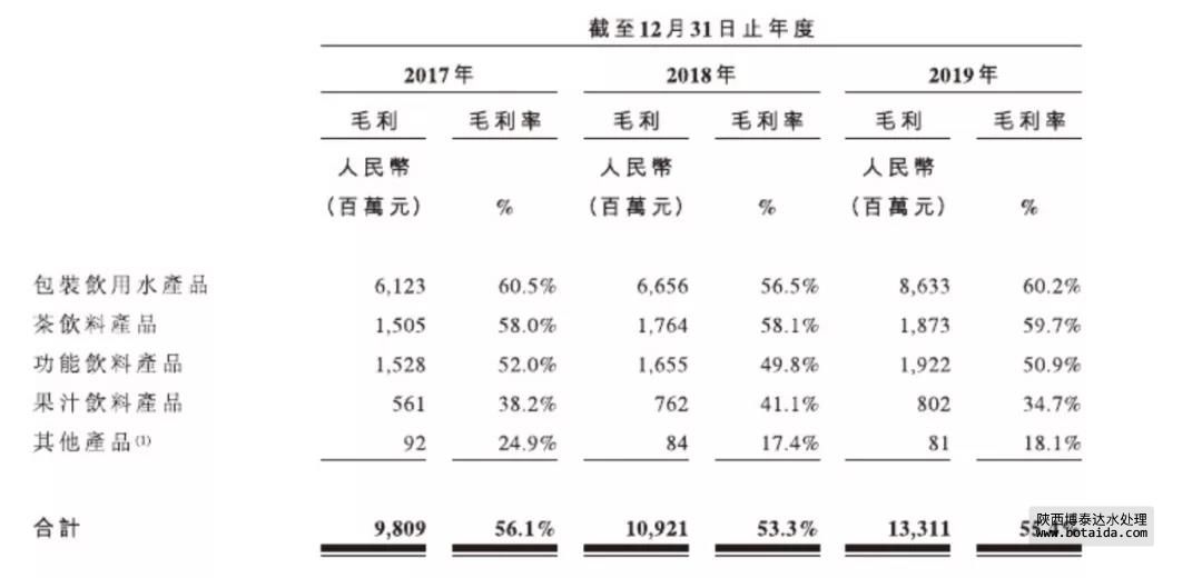 農夫山泉的招股書顯示,公司的大類產品毛利率可謂是出奇的高,尤其是包裝飲用水產品,更是高達60.2%。此外,茶飲料和功能飲料的毛利率也超過50%,分別為59.7%和50.9%。