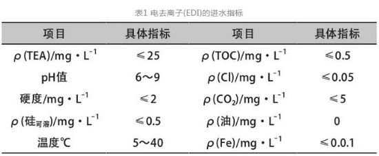 EDI 裝置在電廠中得到了廣泛的應用,它屬于較為精細的水處理系統(tǒng),在水處理的過程中,必須要求進水有較高水質(zhì),才能滿足處理的要求。在一般情況下EDI 對進水水質(zhì)的要求具體如表1 所示,主要采用RO 作為火電廠的廢水預脫鹽軟化處理設(shè)備。