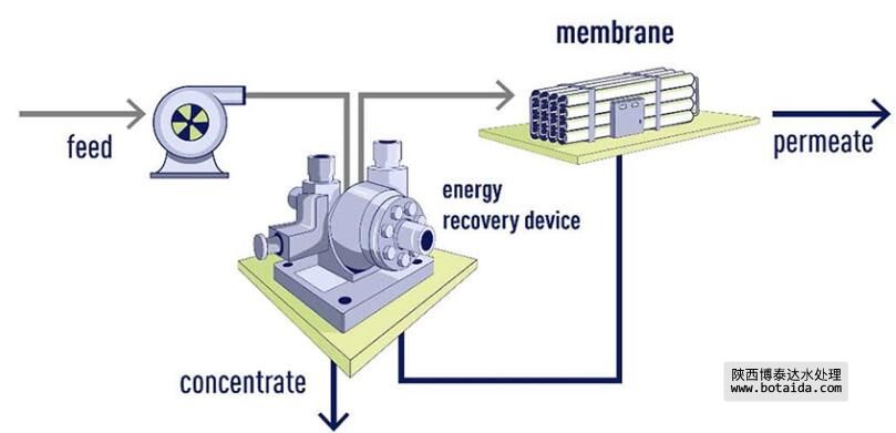 圖2:帶能量回收裝置的反滲透膜系統的工藝流程圖