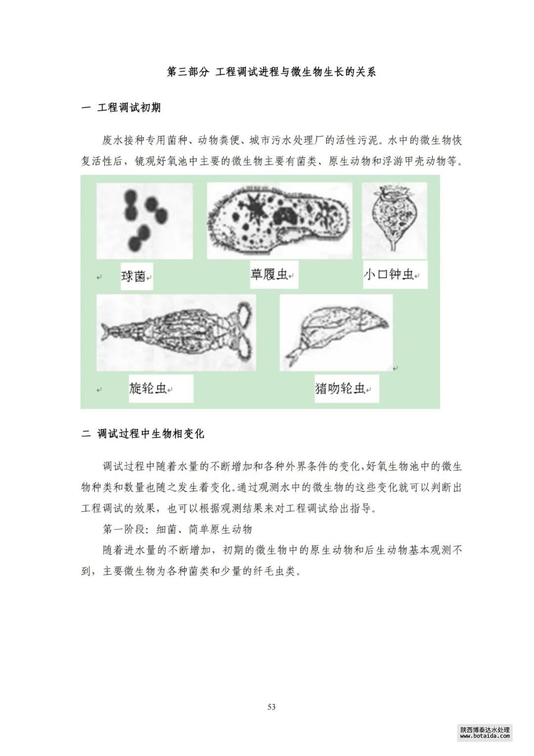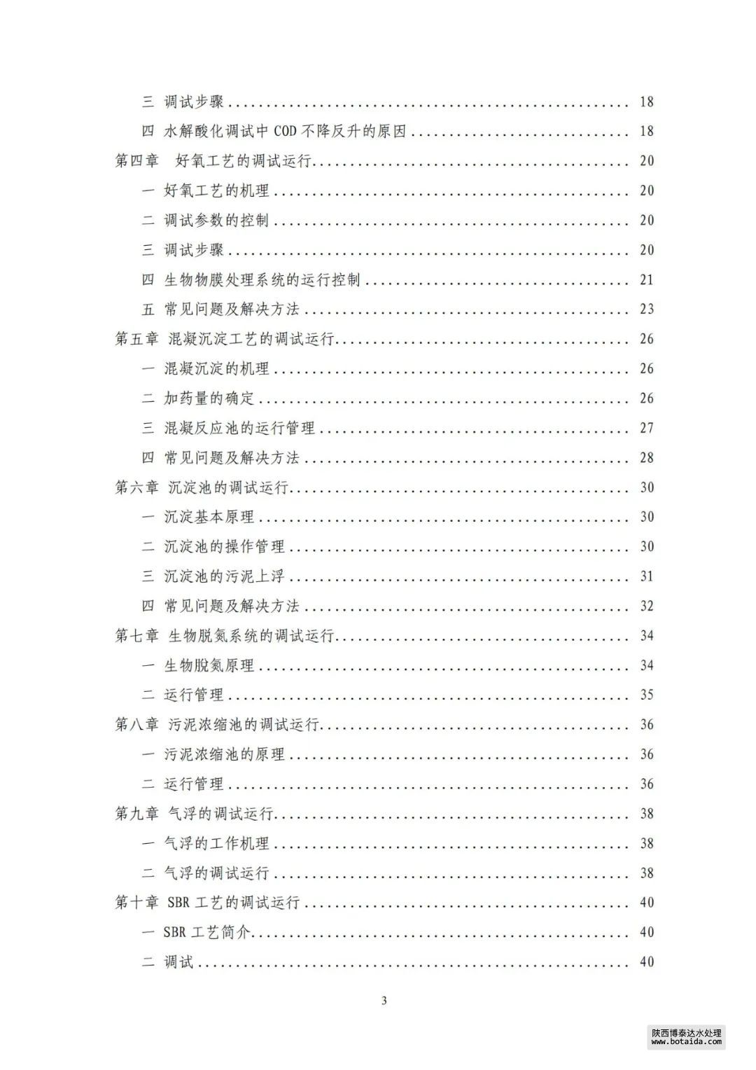 本手冊共包含四大部分,其中主要有:調試條件、調試準備、試水方式、單機調試、單元調試、分段調試、接種菌種、馴化培養、全線連調、檢