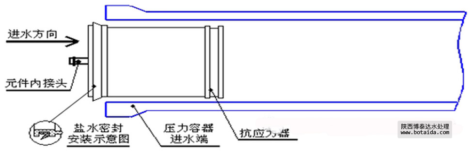 2.3取出新的膜元件,檢查元件上鹽水密封圈位置和方向是否正確(鹽水密封圈開口方向必須面向進水方向),如下圖: