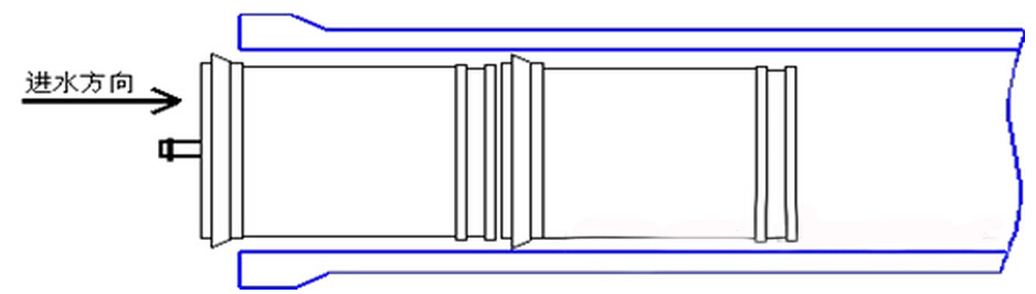 2.4將膜元件不帶鹽水密封圈的一端從壓力容器進水端平行地推入膜殼,直到元件露在壓力容器進水端外面約10公分左右。見上圖: