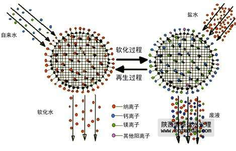 由于水的硬度主要由鈣、鎂形成及表示由于水的硬度主要由鈣、鎂形成及表示鈉離子交換軟化處理的原理是將原水通過鈉型陽離子交換樹脂,使水中的硬度成分Ca2+、Mg2+與樹脂中的Na+相交換,從而吸附水中的Ca2+、Mg2+,使水得到軟化。如以RNa代表鈉型樹脂,其交換過程如下: